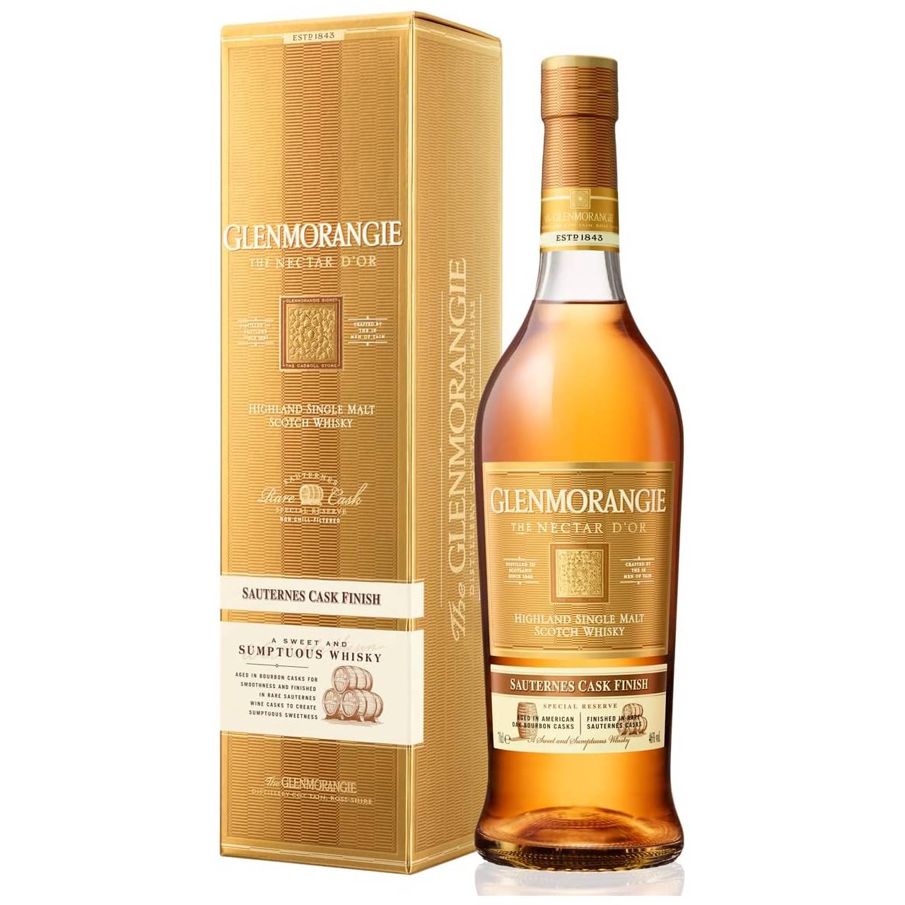 Il Nectar d’Or è uno Scotch Whisky unico nel suo genere, un vero e proprio esercizio di stile dei Mastri distillatori di Glenmorangie. Acquavite ottenuta da malto purissimo, rivela un carattere complesso ed elegante: Or come l’oro, nel nome, nel colore e nel prestigio; un Single Malt lasciato maturare dieci anni in botti di Bourbon e, quindi, sottoposto ad un ulteriore affinamento in barriques di Sauternes, procedimento che andrà a conferirgli quegli aromi ricchi e sontuosi e quel gusto seducente che riporta ai grandi vini dolci muffati.